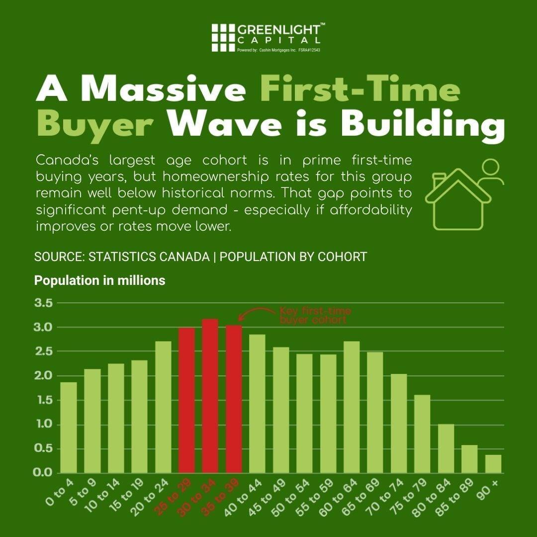 Canada’s largest age cohort is in prime first-time buying years. Yet, homeownership rates for this group remain well below historical norms. This gap signals significant pent-up demand, especially if affordability improves or rates move lower. First-time buyers may soon play a bigger role in driving market activity.