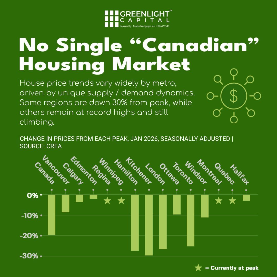 Across Canada, housing price trends vary significantly by region. Some metropolitan areas remain as much as 30% below their peak prices, while others continue to sit at record highs and even climb further.