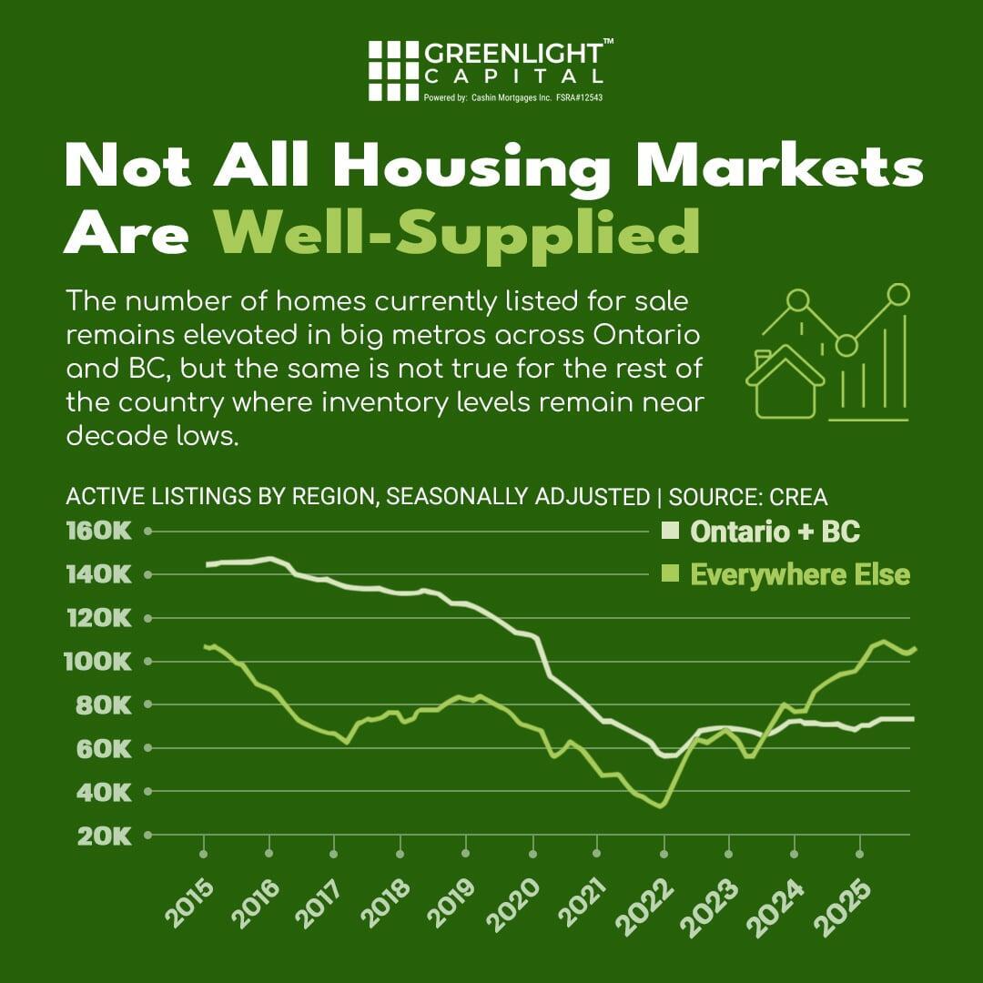 Not all housing markets are equal. Inventory remains elevated in major metros across Ontario and British Columbia, but many other regions have listings near decade lows. Limited supply in these areas can keep competition and prices high for buyers.