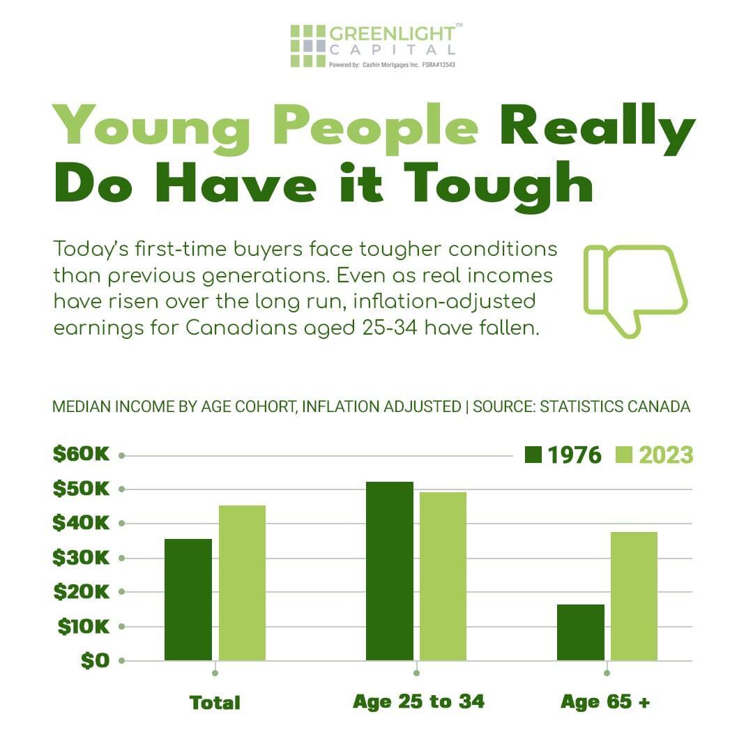 First-time buyers are feeling the squeeze more than ever. While long-term incomes have grown, inflation-adjusted earnings for Canadians aged 25–34 have actually declined. Rising home prices and higher borrowing costs make saving for a down payment increasingly difficult.