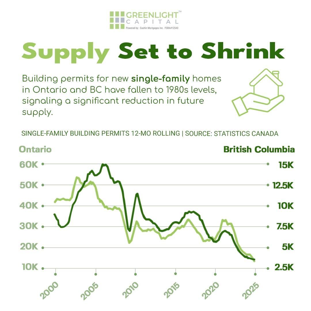 Building permits for new single-family homes in Ontario and British Columbia have fallen to levels not seen since the 1980s. This sharp reduction in future supply could put upward pressure on home prices in key markets, highlighting opportunities for strategic investments.